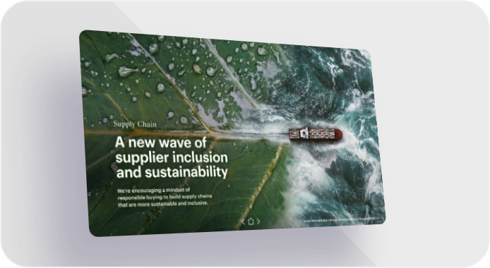 Supply Chain A new wave of supplier inclusion and sustainability We’re encouraging a mindset of responsible buying to build supply chains that are more sustainable and inclusive. United Nations Global Compact: Communication on Progress 2020 | 40