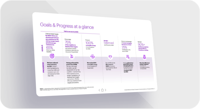 Goals & Progress at a glance Path to net-zero by 2025 Science-based target: By 2025 reduce our absolute greenhouse Encourage Procure Gender- Grow our percentage Maintain gas emissions by 11% of women managing and our scope 1 and 2 75% 100% balanced directors to at least 90%+ greenhouse gas workforce by 2025 S emissions by of key suppliers to renewable energy employee completion disclose their targets in our locations 25% rates for Ethics & AL 65% and actions toward by 2023 worldwide by the Compliance training GO from our 2016 emissions reduction by end of 2020 baseline the end of fiscal 2020 S We have reduced Having achieved this We reached 30% Our workforce was Having achieved our More than 99% of our total emissions goal in fiscal 2019, renewable energy 45% women in goal of 25% women people completed by 32% we set a new goal in our locations in 2020 and women managing directors their Ethics & , scope 1 by the end of 2020, Compliance training OGRESand 2 emissions by for 2025—we will fiscal 2020 accounted for 49% of we have now set a in fiscal 2020 more than 39% and require 90% of our key new hires new goal of 30% PR emissions per unit suppliers—representing by 2025 of revenue by more three-quarters of our than 45% scope 3 emissions—to disclose their targets and actions. Already, 57% have disclosed both targets and actions. NOTE: In geographies where measured, we have set race and ethnicity goals that represent the communities we serve. (SDG 10.2) See page 16 for more detail. See page 66 for a more complete look at our Goals & Progress. United Nations Global Compact: Communication on Progress 2020 | 5